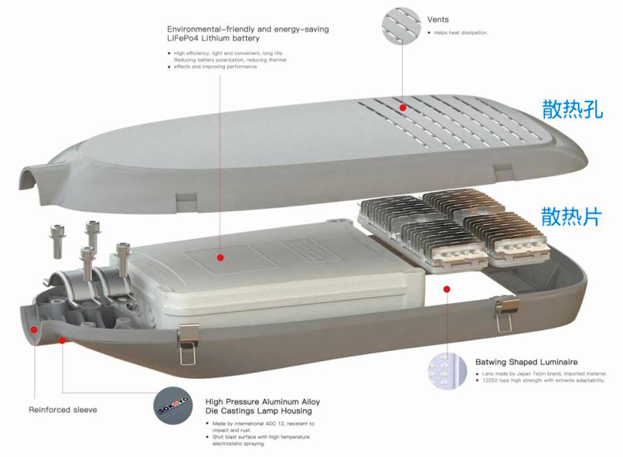 鴻泰太陽(yáng)能路燈采用導(dǎo)熱性極佳的散熱片,內(nèi)腔空間大,熱交換面積大,帶走更多熱量。